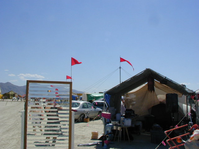 | The mirror was the first piece that Greg created for Burning Man, and 2002 marked the 3rd and final year we took it to the playa. It was made of alternating strips of mirror and glass, and made some great effects when two people stood on either side of it. It made a great conversation starter for outside our camp.