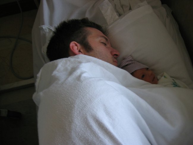 Papa demonstrating the wrong way to sleep with a newborn. Love those hospital beds...