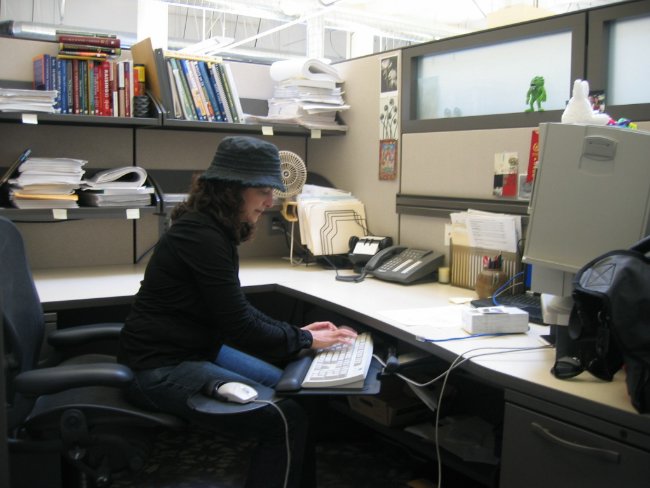 December 3, 2005: Michele at her desk for one last time, typing her resignation letter.