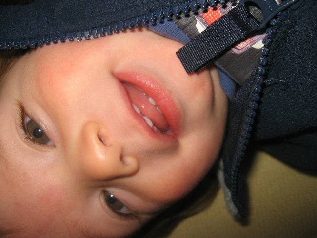 Ryder got his first top two teeth this March, and ended his seventh month with four teeth. We had to turn him upside down and tickle him to get this photo.