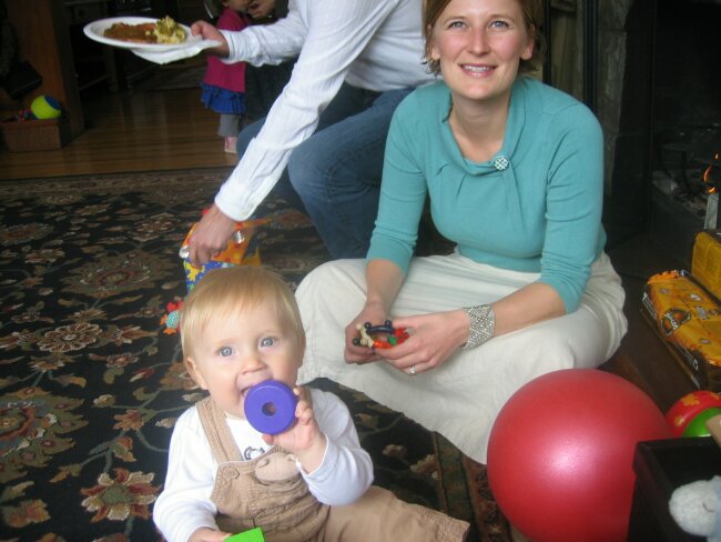 We had some friends over to celebrate Greg's birthday and to warm our newish house. Here are Caelen and his mom Bridget. And that's Aaron's arm.