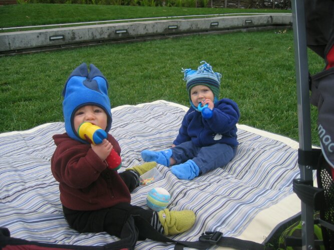 A walk in Golden Gate Park, with a stop to crawl around and play with toys, kept the boys entertained.