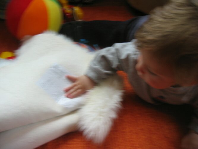 Not a good photo, but we wanted to capture one of Ryder's obsessions. These days he often turns over things to see the back or, in this case, the label.