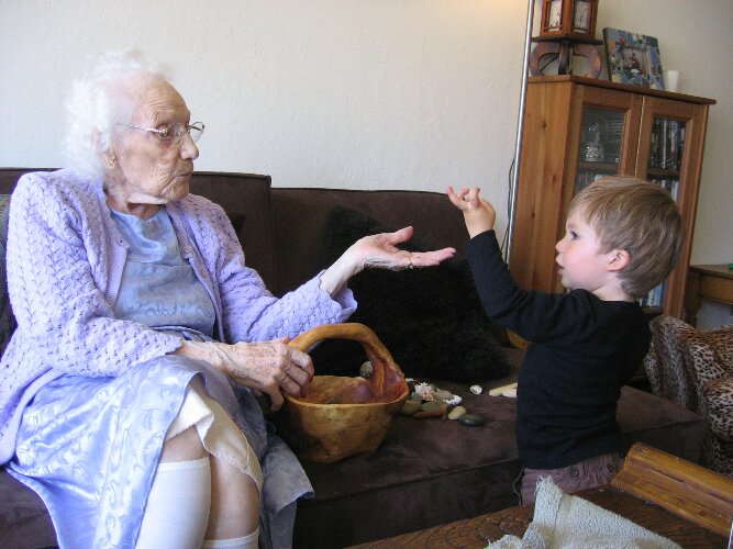 Showing Great, Great Grandma Lee his rock and shell collection