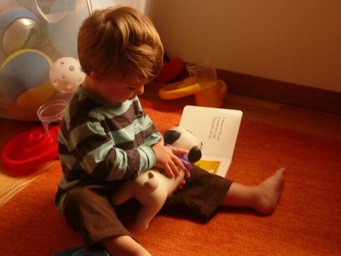 Reading to his doggie bank