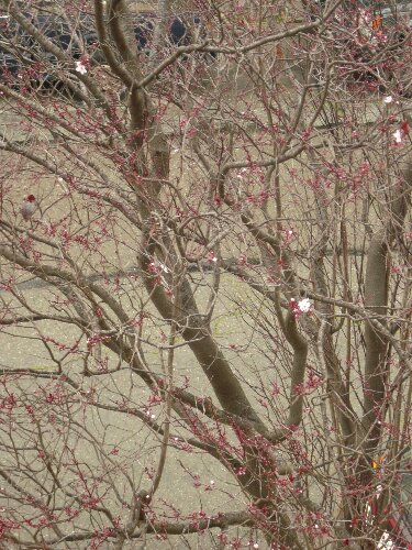 The first blossoms on the plum tree outside of our house.