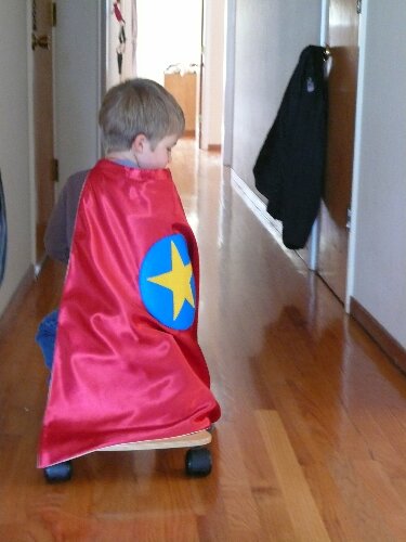 Our superhero takes to the hallway with great speed.