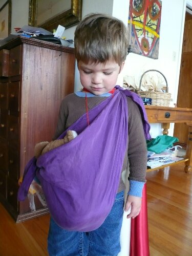 Ryder recently adopted Belinda Bear from Michele and often wears her in a sling.