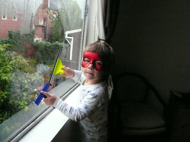 Our masked man, cleaning the windows