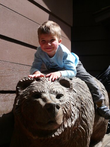 Ryder asked to be photographed by each of the carved bears by the restrooms.