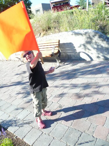 Waving one of Ketchum's street crossing flags