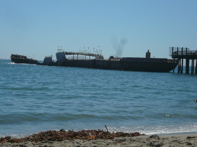 Seacliff Beach's half-sunken cement ship, the USS Palo Alto. It was hauled to this location to serve as an amusement center, but the company went bankrupt, so now it just sits there and decays.