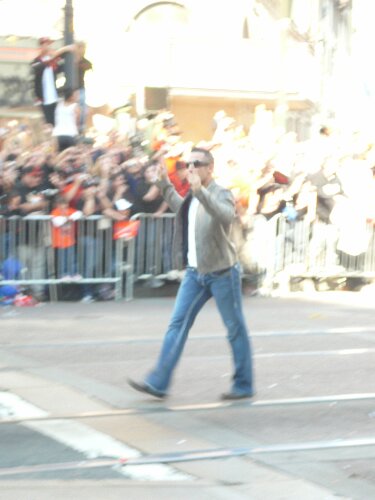 Andres Torres was the only Giant who got out of his "cable car" and walked the whole route. He was also the only one not sporting the official "parade" merchandise. Man has style.