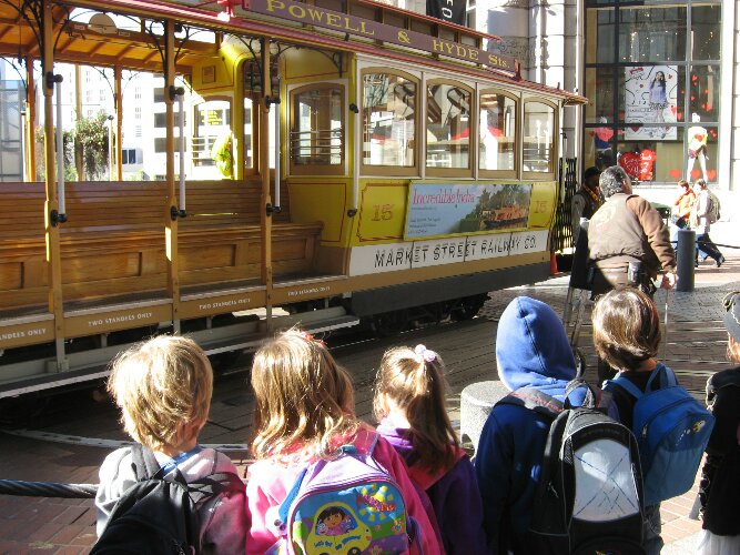 The kids took four forms of transportation that day: walking, an electric bus, a street car and a cable car.
