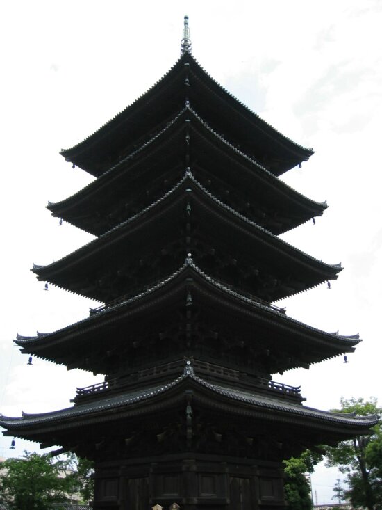 | | The five-storey pagoda of To-ji burned down five times and was rebuilt in 1643. Now the highest pagoda in Japan, at 57 meters tall, it has a lightning rod and large grounding cables. |