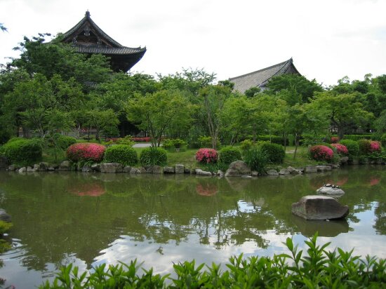 | | The two buildings of To-ji across the pond. The building on the right houses 21 statues representing an Esoteric Buddhism mandala. The left building houses statues depicting the Yakushi (healing Buddha) trinity. |